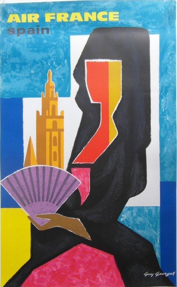 1963 Air France Poster by renowned artist Guy Georget. In typical Georget style with bold colours and striking modernist image of Spanish woman with fan.