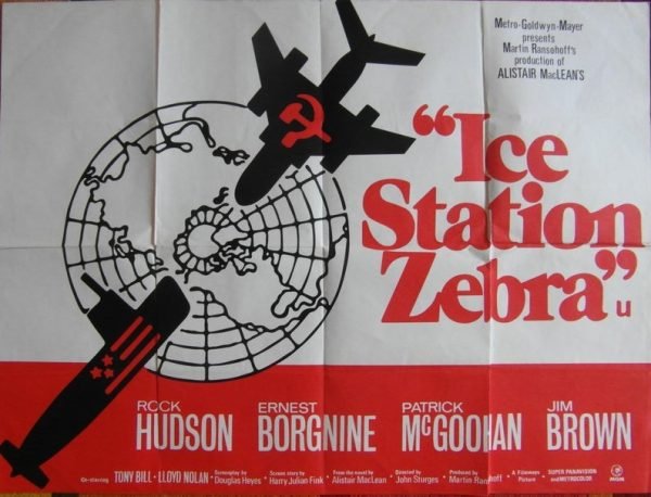 1968 scarce first release UK quad poster for the military film ‘Ice Station Zebra’. Great cold war graphics economically illustrating the central themes of the movie.