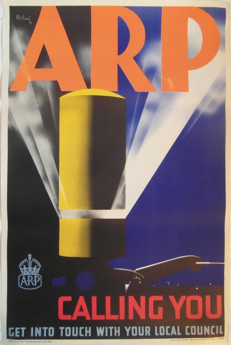 Original art deco 1938 WW2 ‘ARP’ air raid precaution poster issued by the Home Office. Stunning colours and graphics by Patrick Keeley.