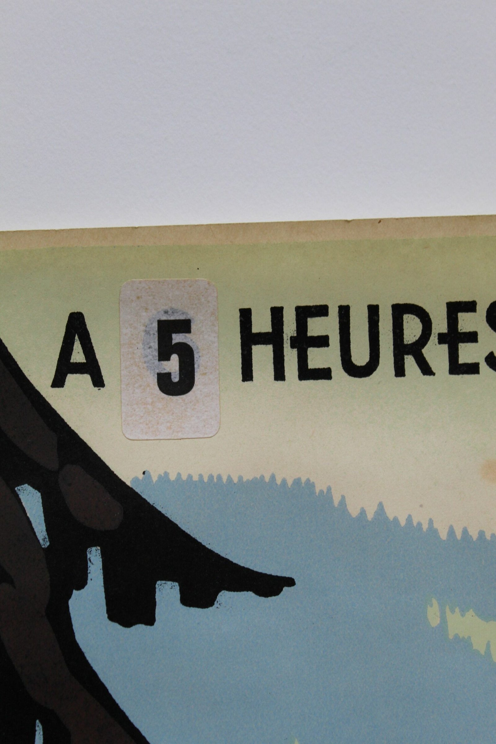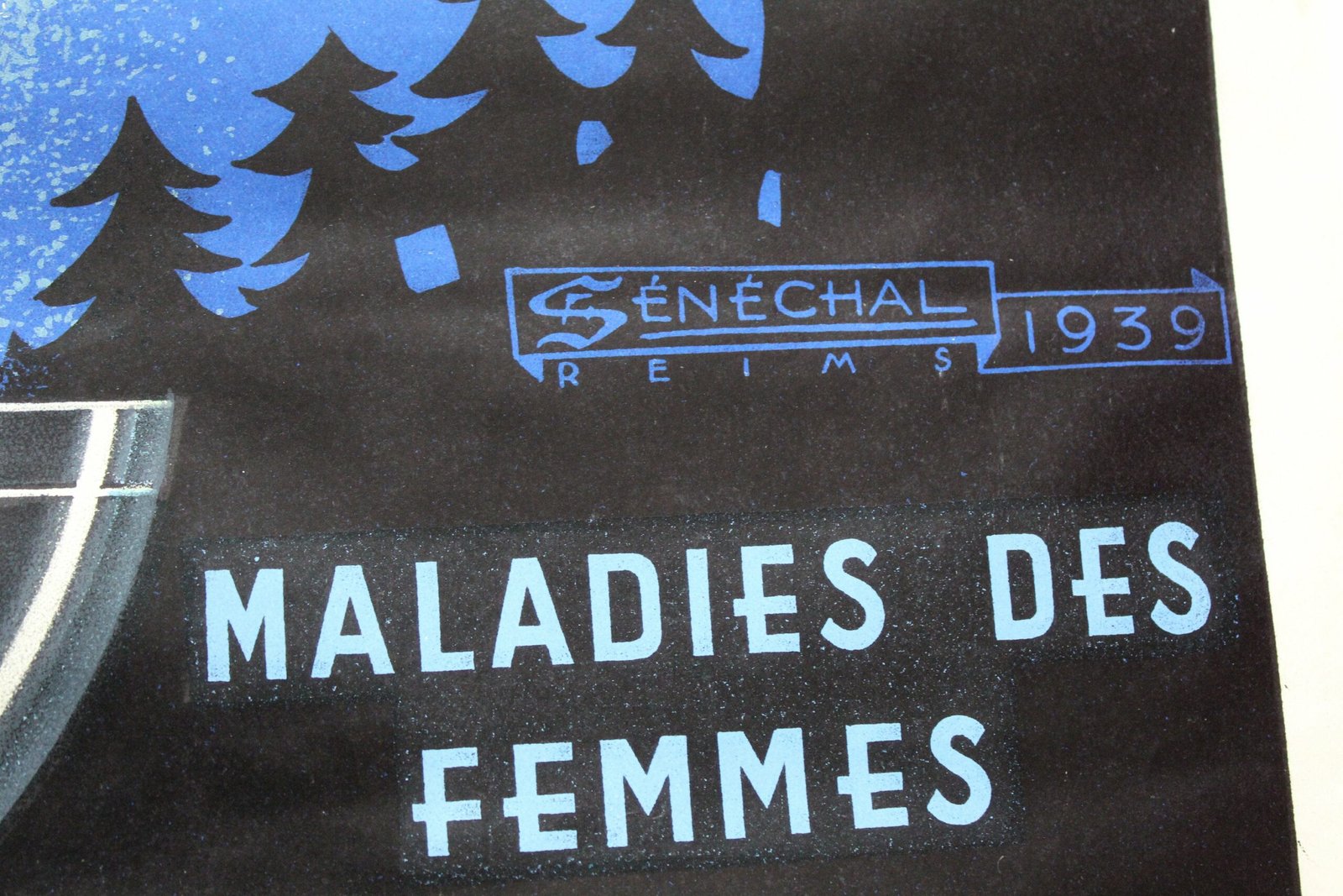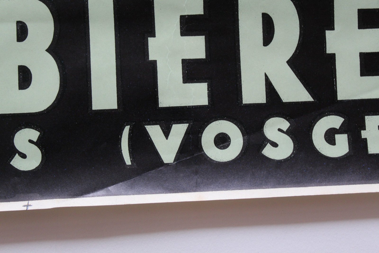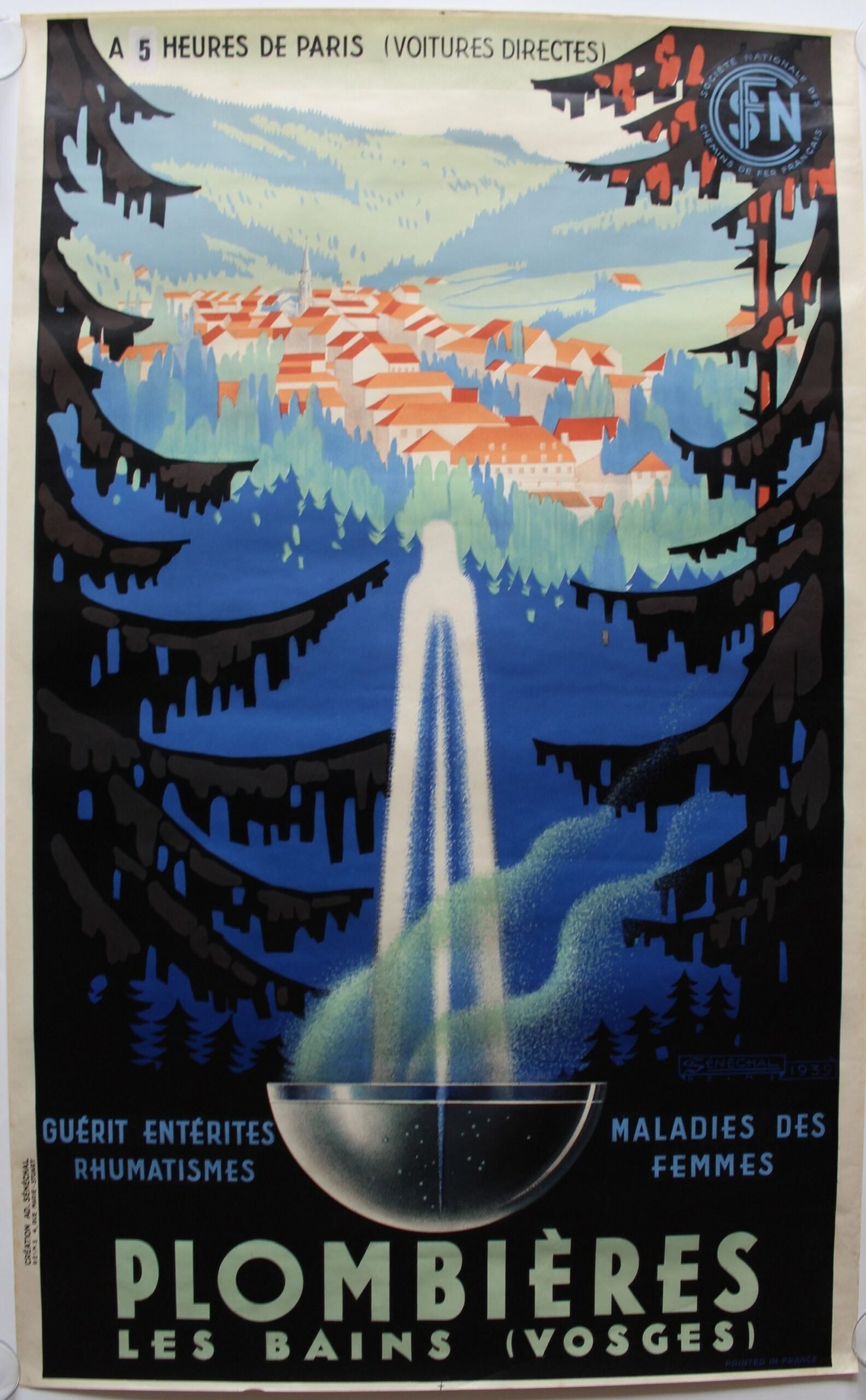 Lovely original 1939 Art Deco Poster Promoting the Spa Town Plombières-les-Bains situated in the Vosges region of Eastern France. Les Bains refers to the hot springs in the area. The springs were promoted as beneficial for various medical conditions. The poster would have been displayed in travel agents and tourist offices. The distance from Paris would be changed with a sticker depending on the location of the travel agent or tourist office.