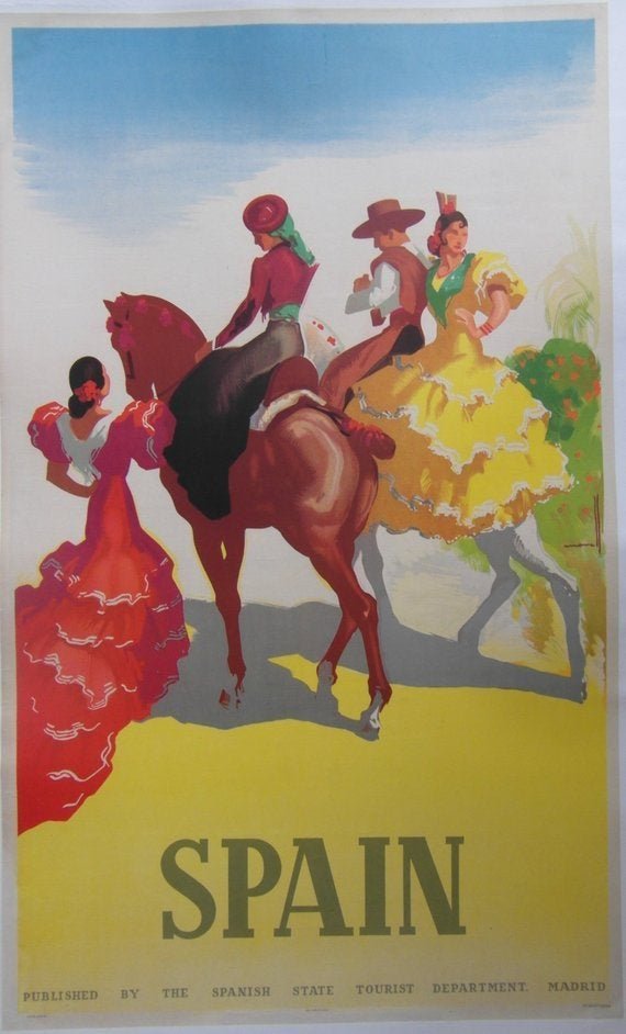 Beautiful original post-war Spanish State Tourist Department poster promoting Spain as a holiday destination. The image depicts Andalucian men and women in colourful traditional dress on horseback. The image is reminiscent of the art deco style.