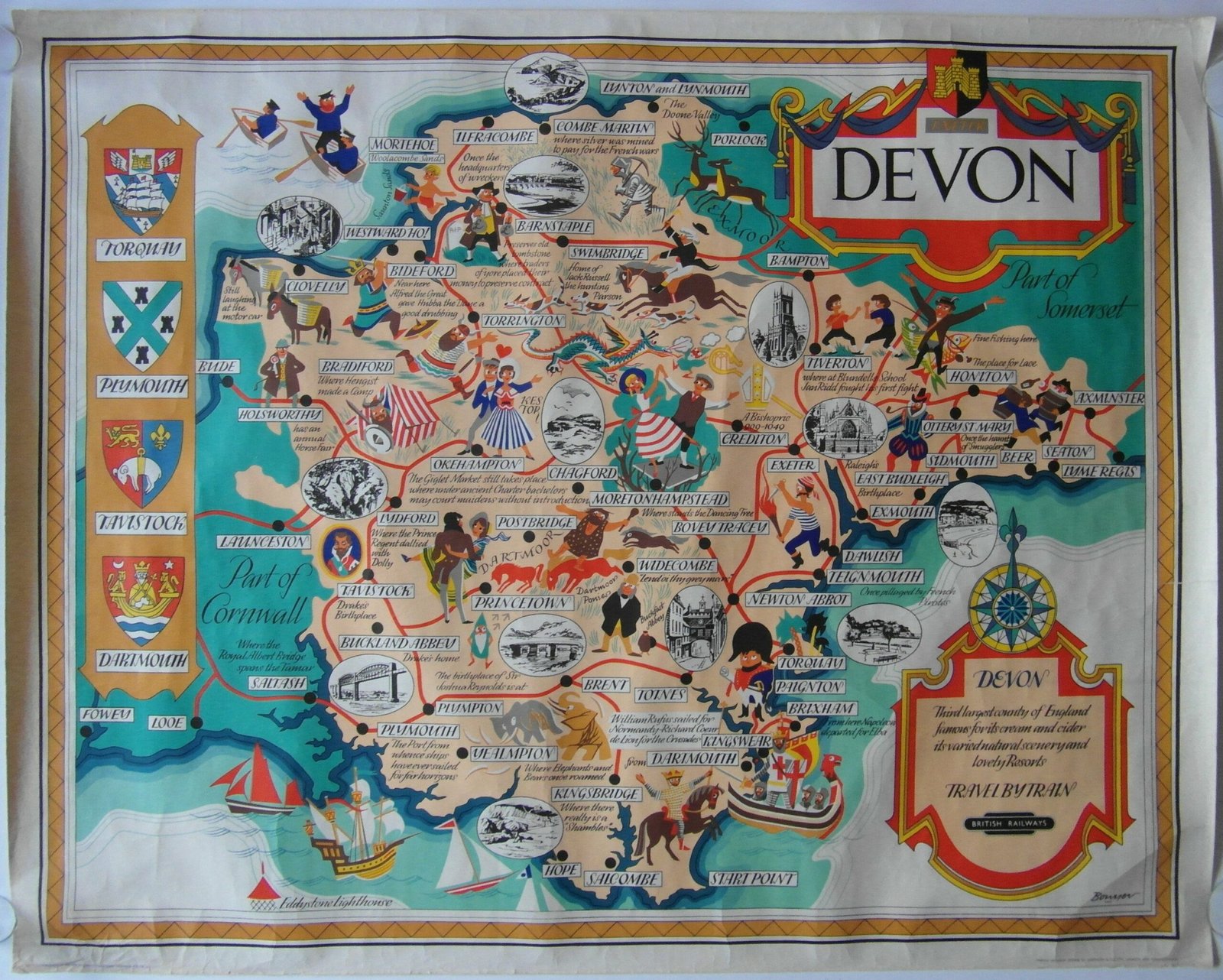 Original 1950s British Railway pictorial map of Devon by Bowyer.