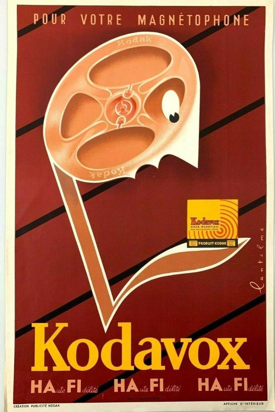 1955 original lithograph poster for Kodak Kodavox. Kodavox audio tapes were produced by Kodak and were extremely popular in France in the late 1950’s and 1960’s. A magnetaphone is a reel to reel tape recorder invented in the 1930s and used up to the 1970s when chromium dioxide tapes appeared.