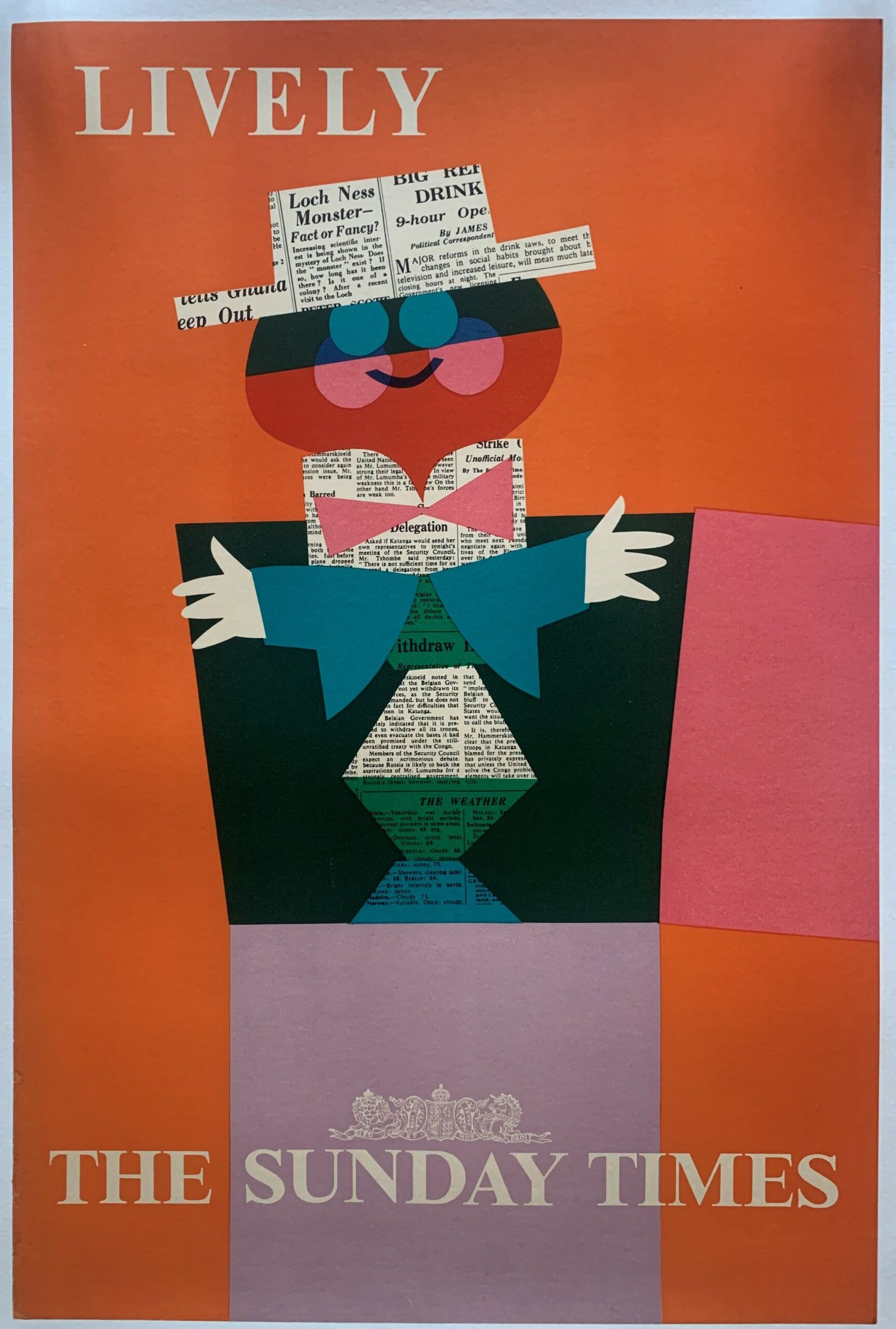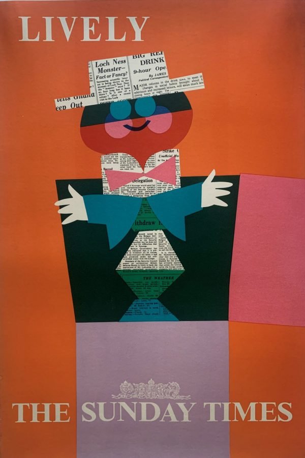 Original 1960 poster promoting the Sunday Times and it’s journalistic qualities. Patrick Tilley did a series of posters for the Sunday Times using the same style of humour and modernism. A classic British mid century poster.