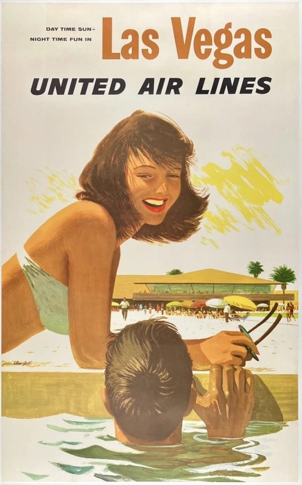 Original 1960 United Airlines poster to promote ‘Las Vegas’ as a holiday destination by celebrated artist Stan Galli. The poster was produced in the ‘jet age’ period when overseas holidays were becoming more affordable for the masses but still retained the glamour of earlier days when air travel was the preserve of the wealthy. The poster reminds the public that Las Vegas has day and night time activities, a theme beautifully conveyed in Klein’s poster for TWA airlines which I also have listed.
