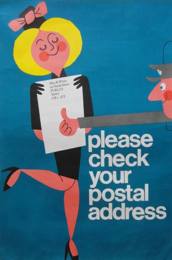 Original Post Office poster for a public campaign urging people to address their post correctly. Artwork by Harry Stevens who produced numerous poster designs for London Transport and the Post Office. His work is often humorous and his style is very recognisable.