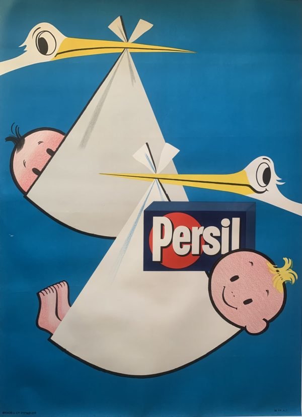 Original 1960s large Persil advertising poster. Printed in France. A humorous image of stalks delivering babies in fresh white linen. It would make a great centrepiece in any home or business.