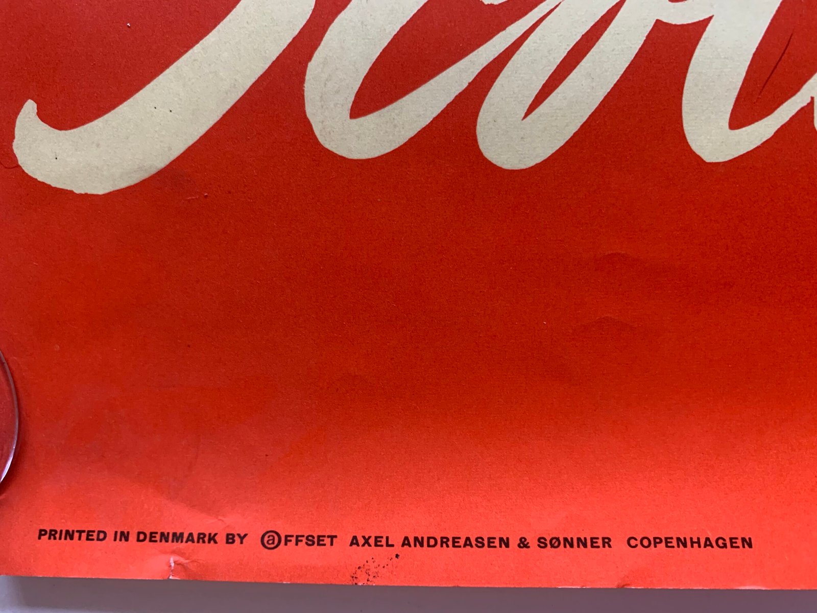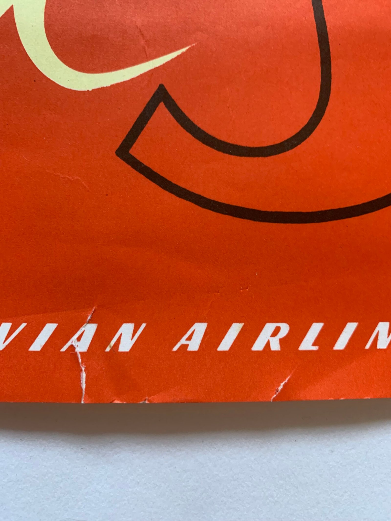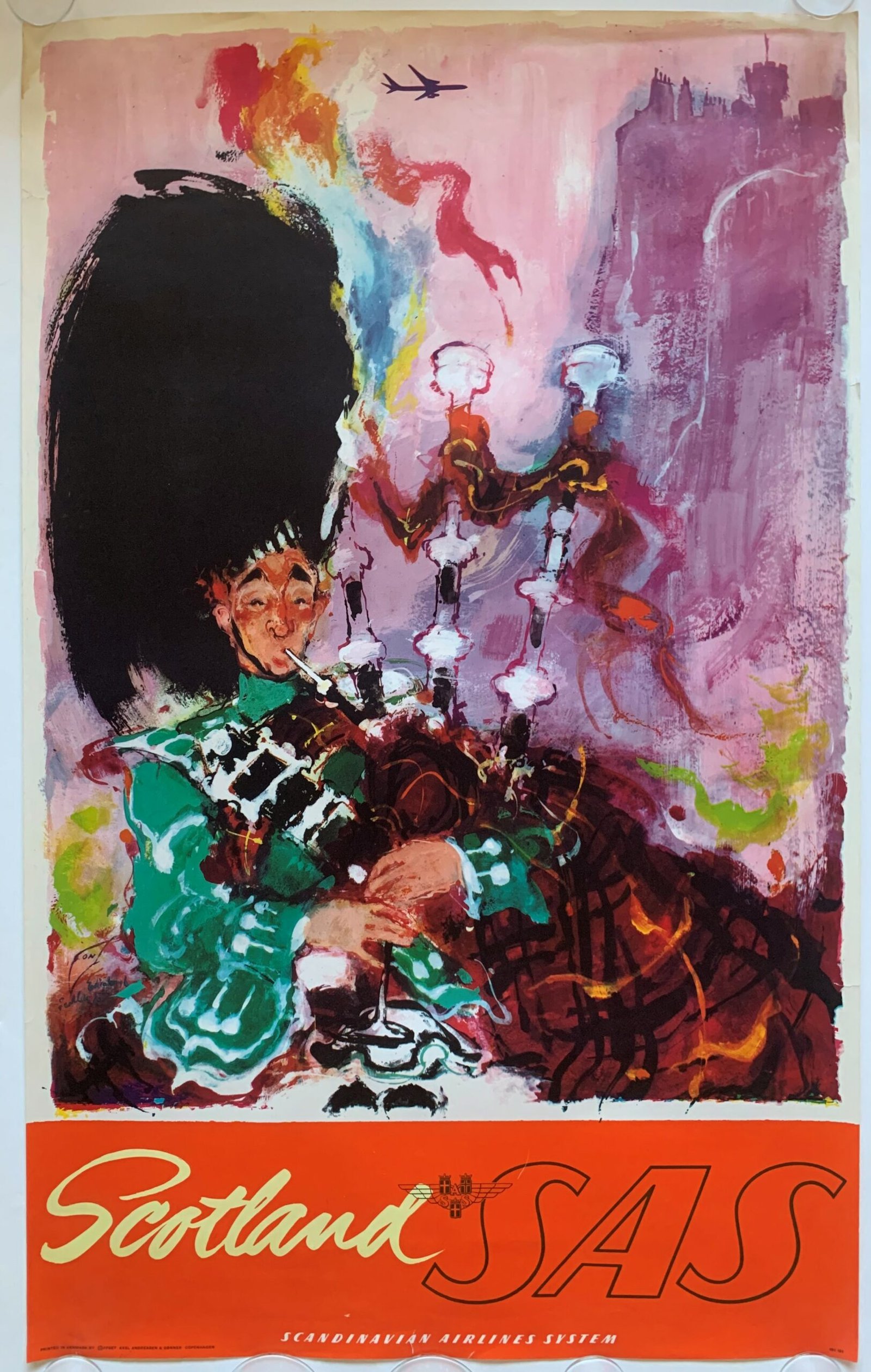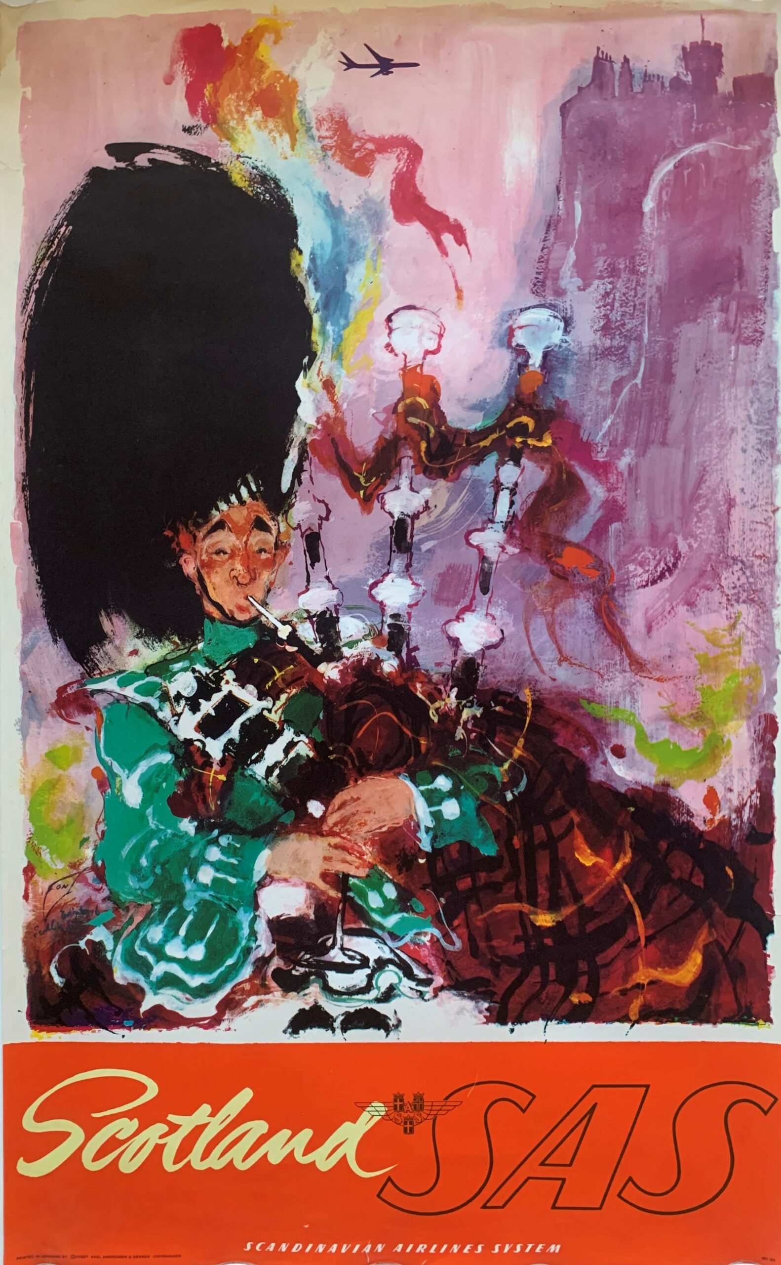 Original 1960s travel poster for Scandinavian Airline Systems, often shortened to SAS, promoting travel to Scotland. One of a series of beautiful posters by Otto Nielsen for SAS depicting a bagpiper.