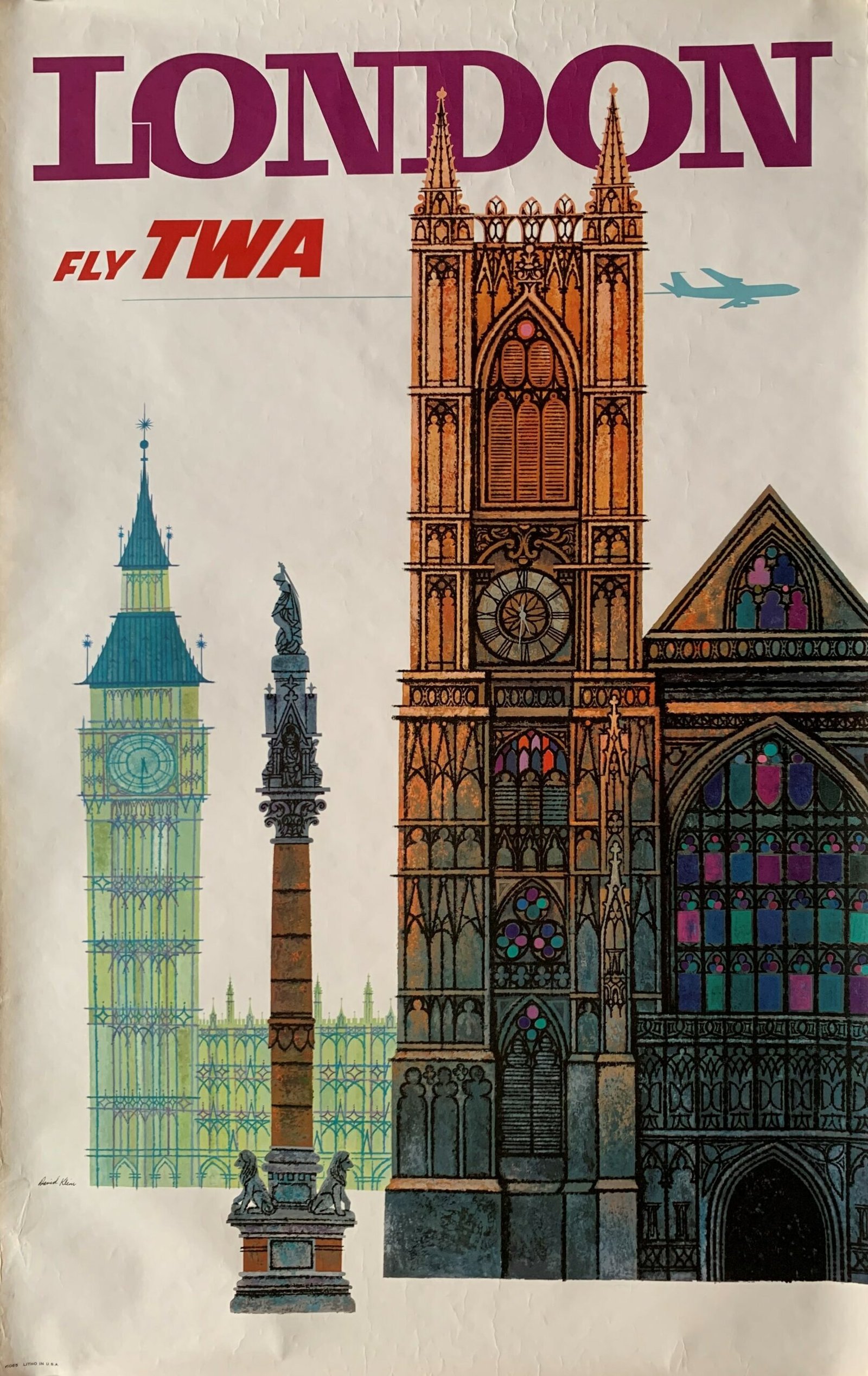 Original 1960s TWA travel poster promoting London as a holiday destination. The poster is a collage of famous landmarks in London including Big Ben and the Houses of Parliament, Westminster Abbey and Nelson’s Column. David Klein is a renowned and prolific American poster artists who’s work is highly collectible.