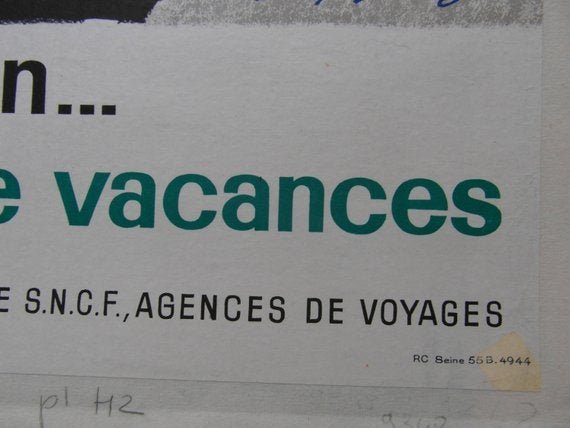 1967 Art deco style poster advertising vacations by train for the French National Railways. Charming naive art.