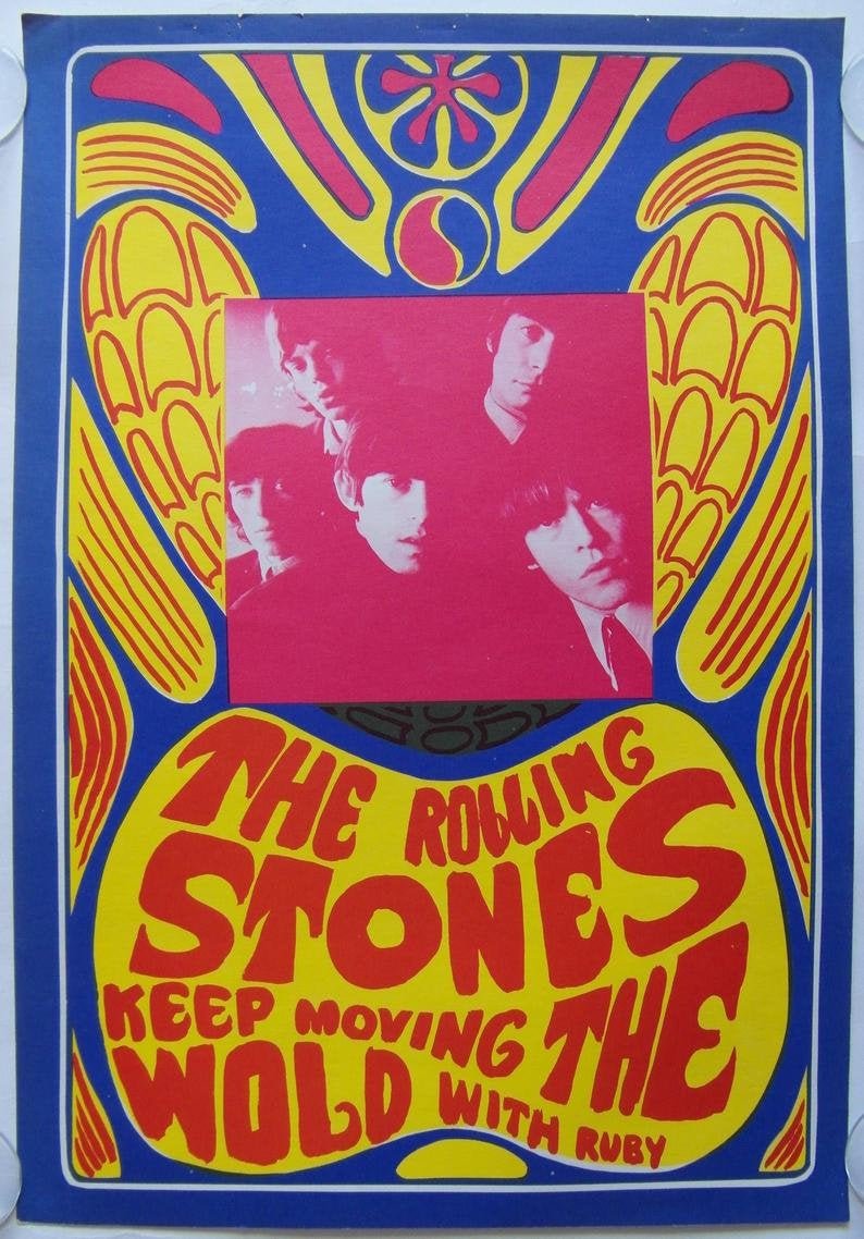 1967 Swedish in-store double-sided Rolling Stones display poster entitled ‘Keep Moving the Wold with Ruby’. The Double-sided poster was part of a poster pack published by KONST- Sweden (Svenska) and distributed by Exclusive Distributors of Hollywood, California. On the back of the poster is a black and white photograph of the artists. Printed on heavy stock paper.