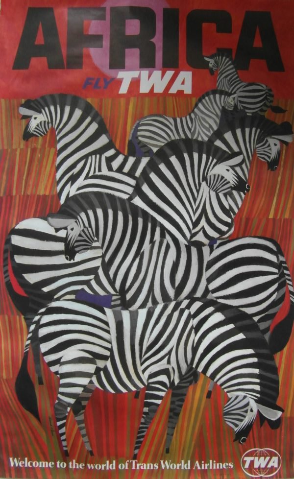Original 1960s TWA ‘Africa’ poster by renowned poster artist David Klein. One of a series of posters for TWA, a major American airline that operated from 1930 to 2001. Beautiful geometric zebra artwork.