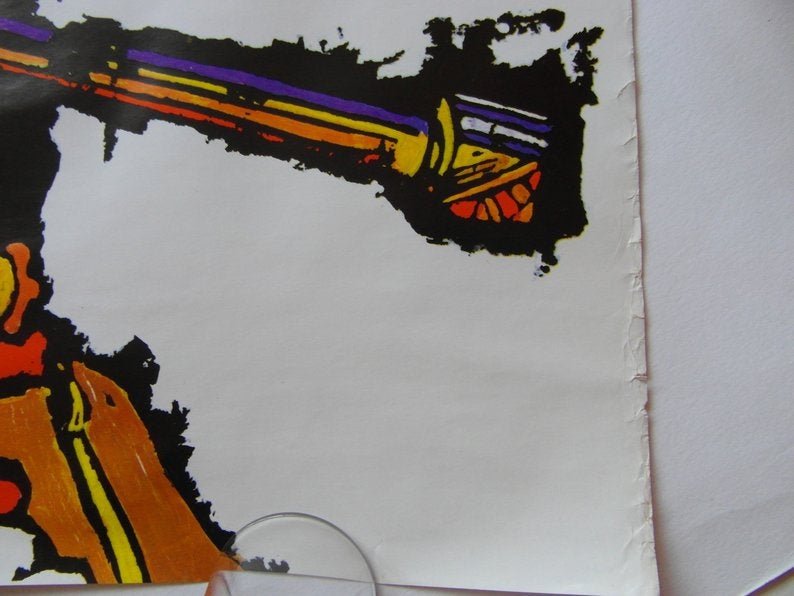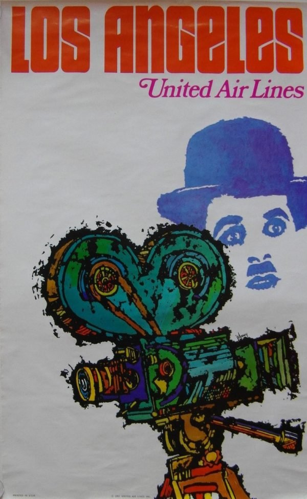 Original 1967 United Airlines ‘Los Angeles’ travel/destination poster celebrating the movie industry and Charlie Chaplin. Artwork by Jebary, this is one of the rarer of the Jebary posters for United Airlines.