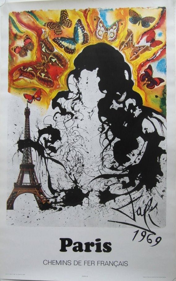 Original French National Railways Poster advertising travel to Paris. One of a series of posters that Dali designed for the French National Railways. Signed in the plate by Dali 1969 and published in 1970.