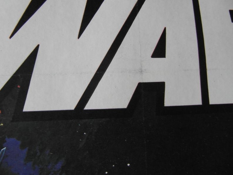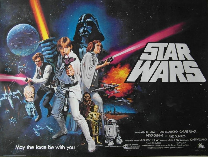 Original 1977 British quad poster for the film ‘Star Wars’ created by George Lucas. This poster is the rarer pre-Oscar version. The later version of this poster featured the Oscar accolades under the Star Wars text. Oscar version also listed.