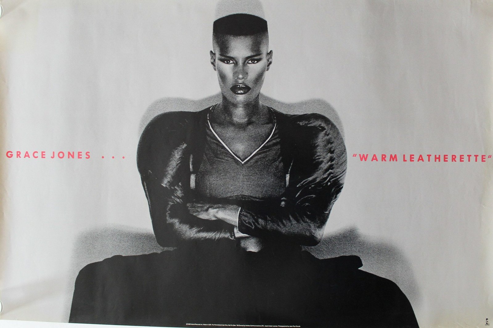 Original Grace Jones USA promotional poster for her 4th studio album ‘Warm Leatherette’ released on 9 May 1980 by Island Records. Warm Leatherette was the first album with cover art designed by her then boyfriend, Jean Paul Goude. The cover image also featured for the first time Grace’s androgynous look with her trademark flat-top haircut.