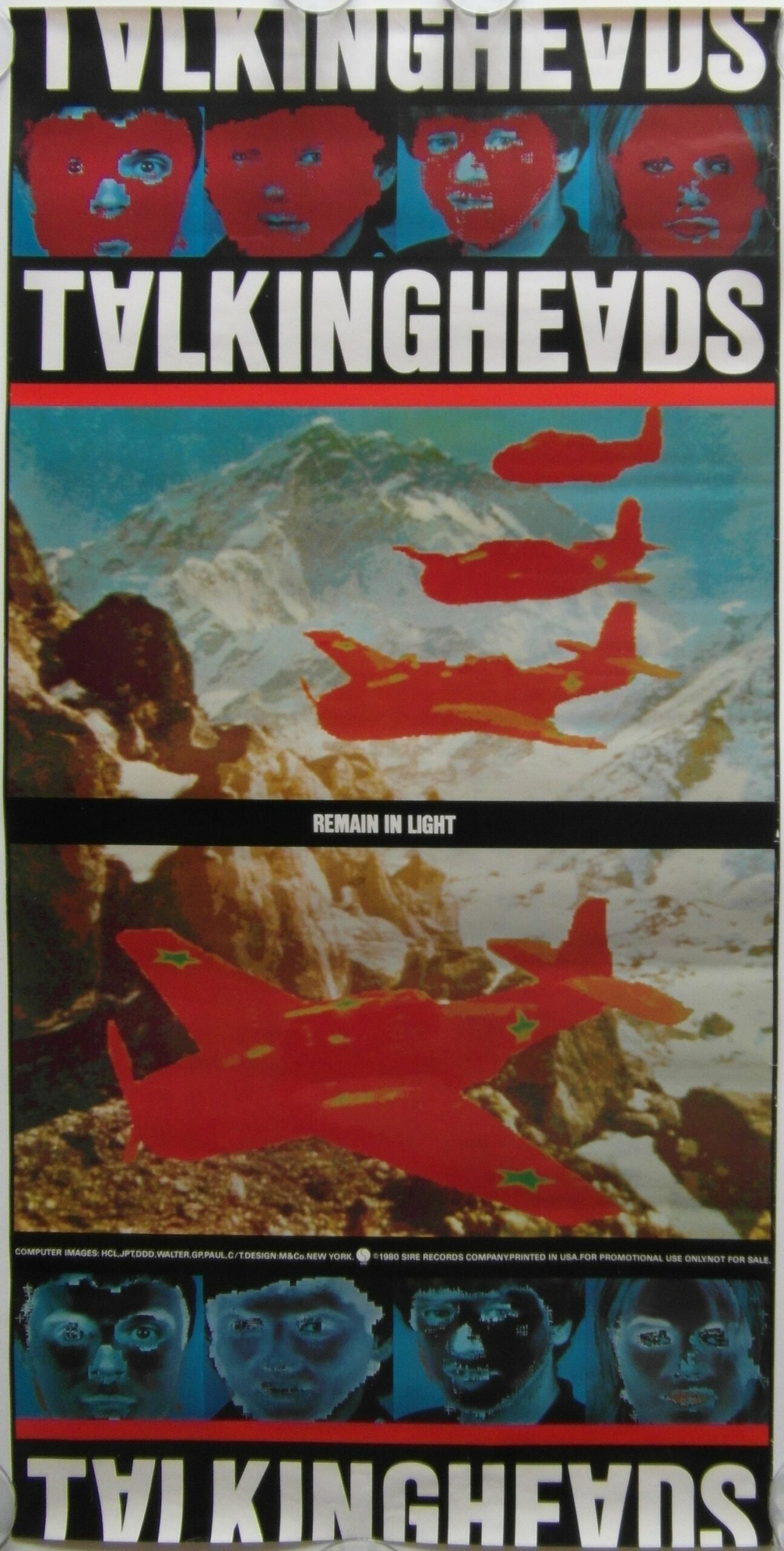 Original Talking Heads promotional poster for their fourth studio album ‘Remain in Light’ released on 8 October 1980. The artwork was conceived by Tina Weymouth [bass] and Chris Franz [drums] with the help of Walter Bender and his MIT media lab team. The red war planes flying over the Himalayas are an artistic depiction of Grumman Avenger planes in honour of Weymouth’s father Ralph Weymouth who was an Admiral in the US navy. The rest of the artwork was crafted by graphic designer Tibor Kalman.