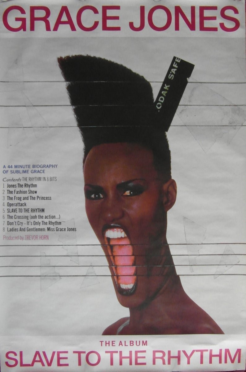Original subway Grace Jones promotional poster for the Album ‘Slave to the Rhythm’ released on 28th October 1985 on Island Records. The art work, designed by Jean Paul Goude, is a montage of several copies of a single photograph of Grace, that makes her hair look extended and her mouth look stretched. Subway posters were produced by the record companies in limited runs and as such are rare.