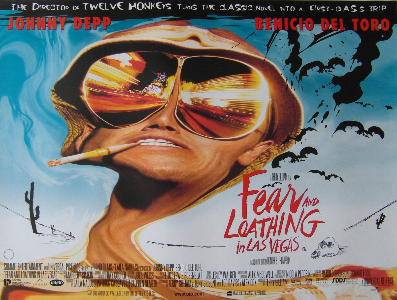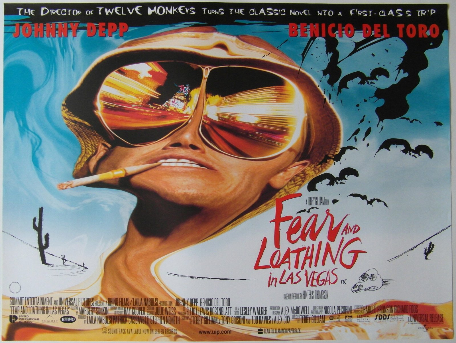 Original UK quad poster for the film ‘Fear and Loathing in Las Vegas’, adpated from Hunter S Thompson’s 1971 novel of the same name. It was co-written and directed by Terry Gilliam, and stars Johnny Depp and Benicio del Toro as Raoul Duke and Dr. Gonzo, respectively. The film details the duo’s journey through Las Vegas as their initial journalistic intentions devolve into an exploration of the city under the influence of psychoactive substances.