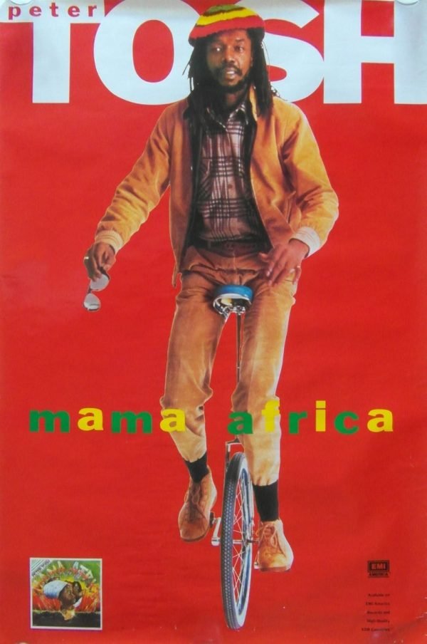 Original 1983 EMI USA Peter Tosh Promotional Poster for the Album ‘Mama Africa’. The poster features Tosh on a unicycle. He would often entertain the audience at live concerns by making his entry on a unicycle.