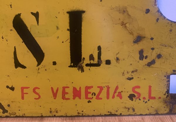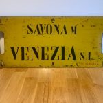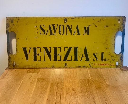 Mid 20th century Italian railway sign – Savona to Venice. On the reverse is Venice to Savona. Nice wear to the sign. Not enamel.