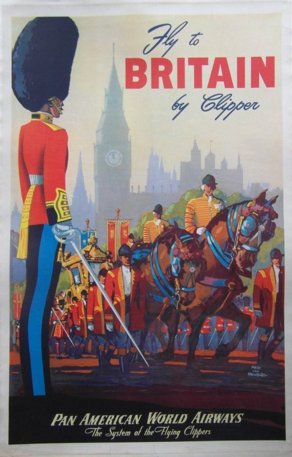 1948 Pan American Airlines travel/destination poster advertising travel to Britain before the era of mass tourism. Iconic images of London in vivid colours with a royal procession and foot guard in the foreground and Big Ben and the Houses of Parliament in the background.