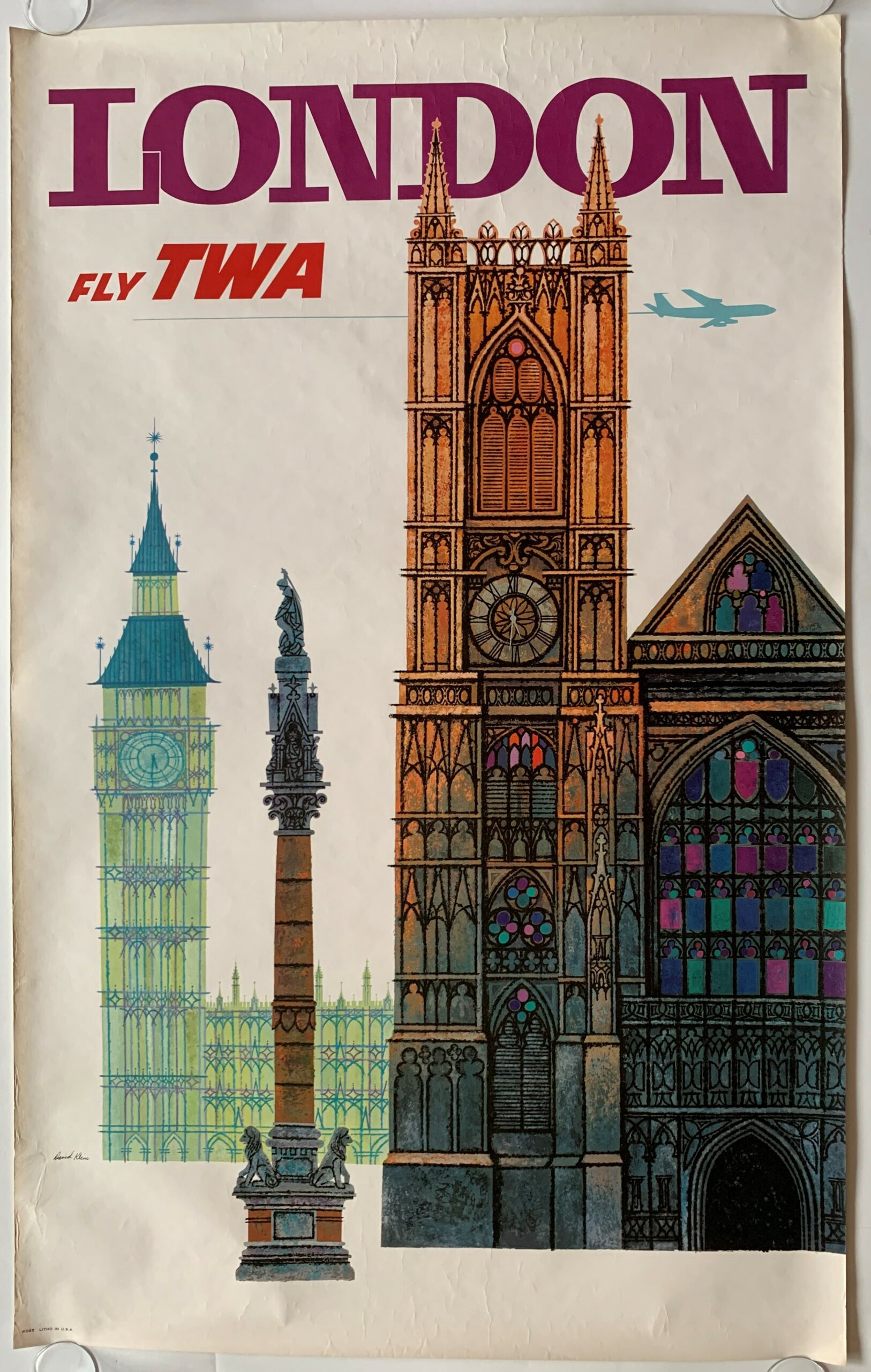 Original 1960s TWA travel poster promoting London as a holiday destination. The poster is a collage of famous landmarks in London including Big Ben and the Houses of Parliament, Westminster Abbey and Nelson’s Column. David Klein is a renowned and prolific American poster artists who’s work is highly collectible.