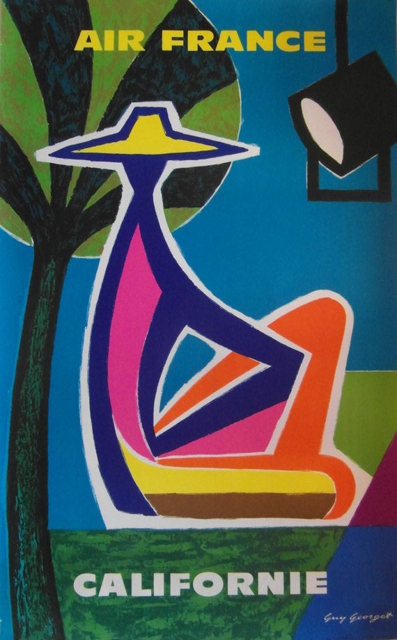 Original 1961 Air France destination poster advertising travel to California. One of the rarer examples of Guy Georget’s work for Air France. Bold, colourful and naive artwork in typical Georget style.