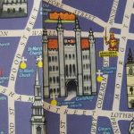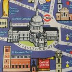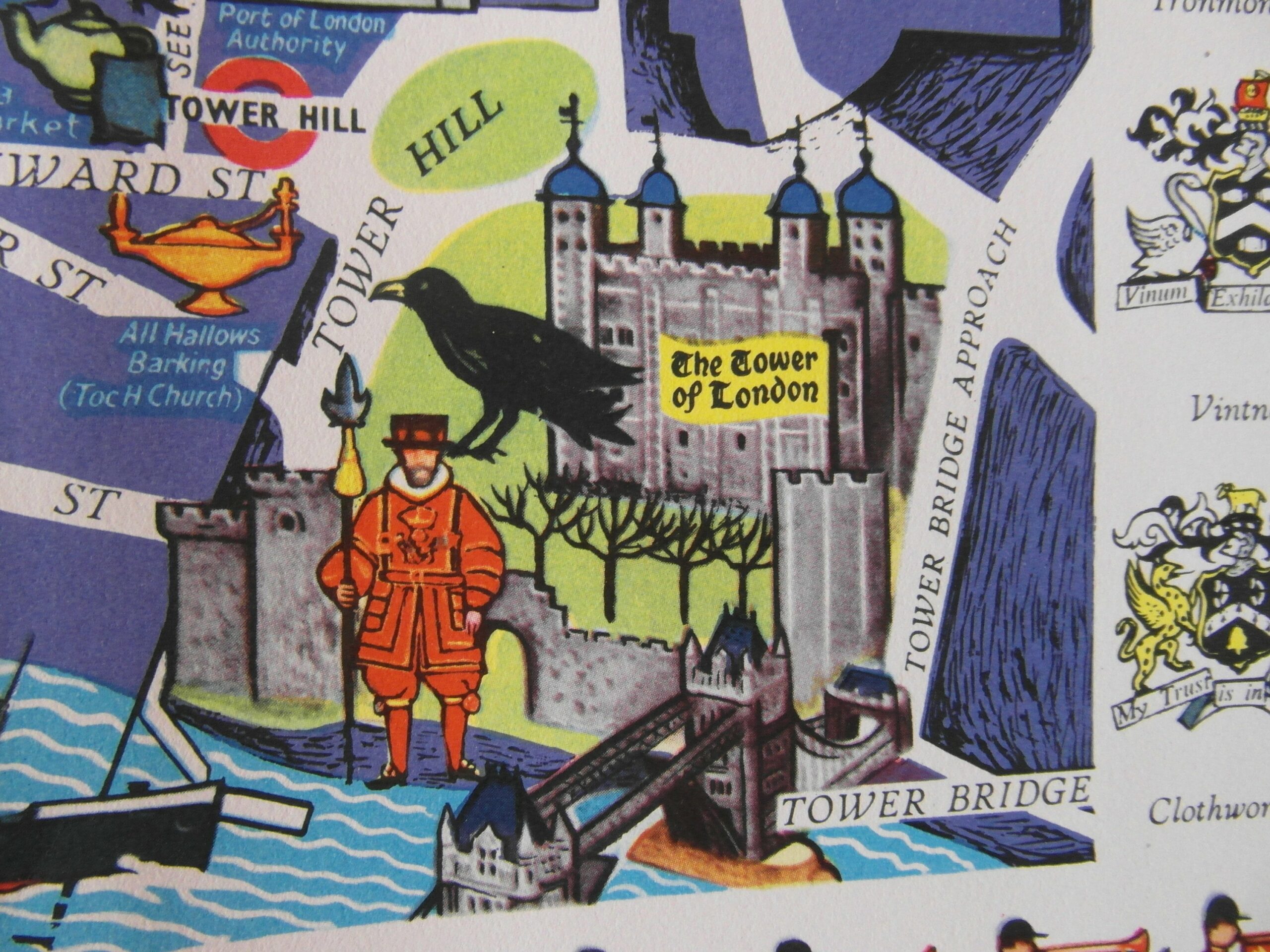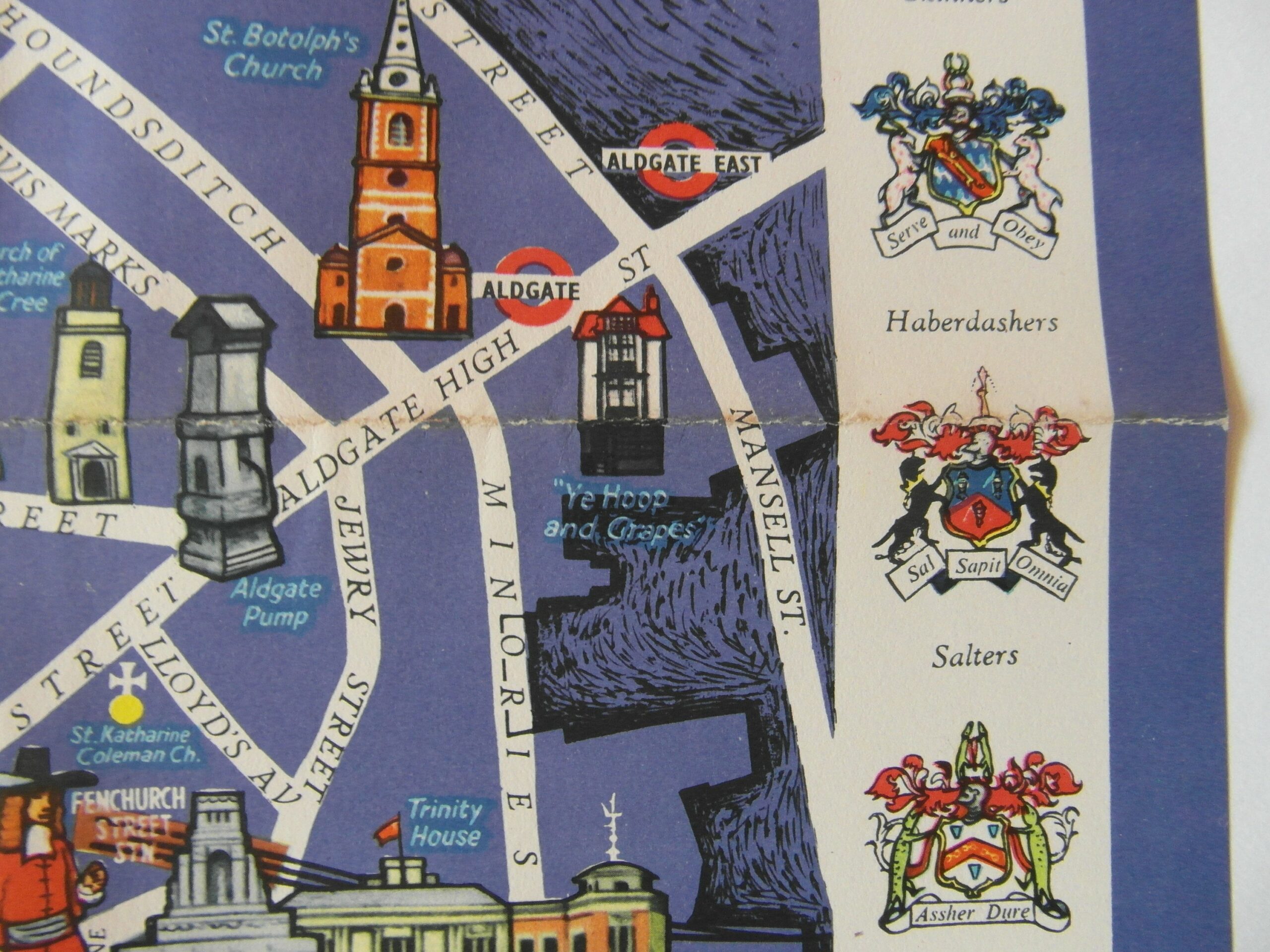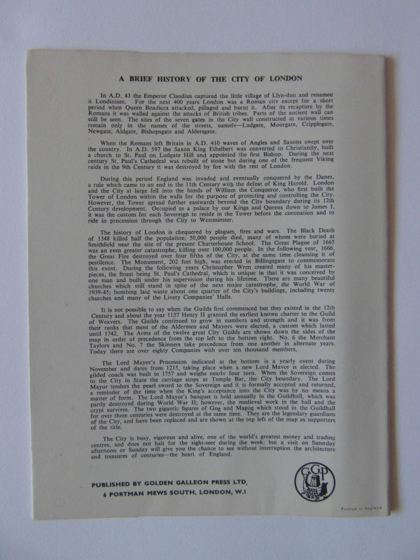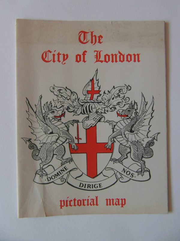 Original c1960 pictorial map of the City of London. Extends from Chancery Lane across to Aldgate East, north to Barbican and south to the river. The Lord Mayor’s Show is depicted at the foot of the poster. With original paper cover.